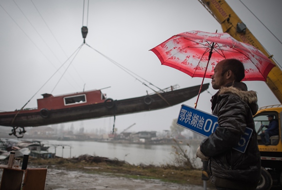 在長江新螺段白鱀豚國家級自然保護(hù)區(qū)漁船拆解現(xiàn)場,漁民夏明星注視著被吊起的漁船(2019年12月25日攝)。新華社記者?肖藝九/攝