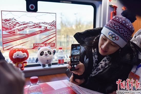 一名乘客正在拍攝2022年北京冬奧會(huì)吉祥物和車窗上的窗花。這些剪紙窗花是由張家口蔚縣剪紙藝人創(chuàng)作,包含了詹天佑畫像、京張高鐵和冰雪運(yùn)動(dòng)等元素。實(shí)習(xí)生 宋欣然/攝