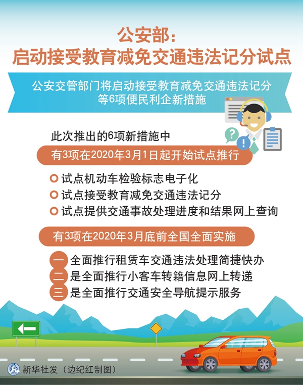 新華社北京1月14日電(劉奕湛、楊凌偉)記者14日從公安部了解到,公安交管部門將啟動接受教育減免交通違法記分等6項便民利企新措施。此次推出的6項新措施中有3項在2020年3月1日起開始試點推行,另有3項在2020年3月底前全國全面實施。