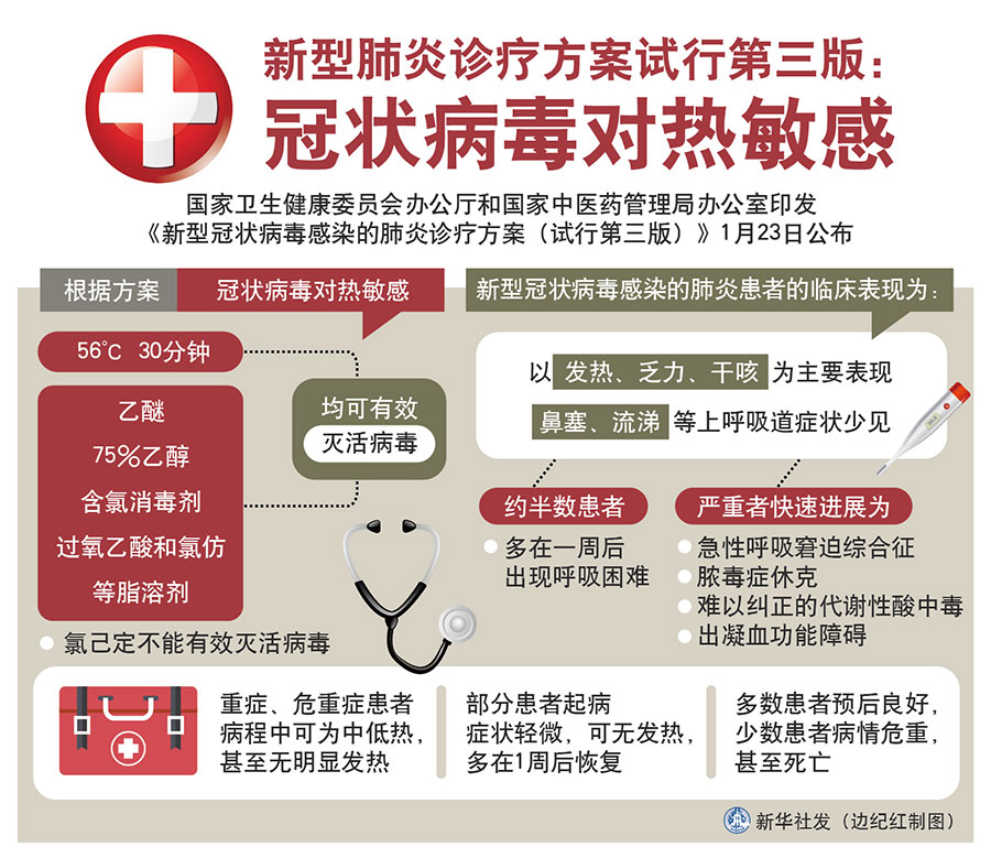 新華社北京1月23日電(記者田曉航、王秉陽)為進(jìn)一步指導(dǎo)全國科學(xué)規(guī)范做好新型冠狀病毒感染的肺炎病例診斷和醫(yī)療救治工作,在組織專家對診療方案進(jìn)行修訂基礎(chǔ)上,國家衛(wèi)生健康委員會(huì)辦公廳和國家中醫(yī)藥管理局辦公室印發(fā)《新型冠狀病毒感染的肺炎診療方案(試行第三版)》,23日公布。方案涉及冠狀病毒病原學(xué)特點(diǎn)、此次疫情的臨床特點(diǎn)、病例定義、鑒別診斷、病例的發(fā)現(xiàn)與報(bào)告等方面內(nèi)容,給出了包括中醫(yī)治療在內(nèi)的治療方案。