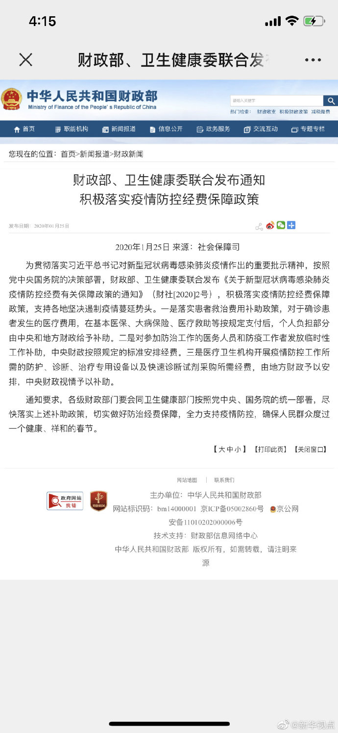 記者25日從財(cái)政部獲悉,財(cái)政部、衛(wèi)生健康委聯(lián)合發(fā)布通知,對(duì)于確診患者發(fā)生的醫(yī)療費(fèi)用,在基本醫(yī)保、大病保險(xiǎn)、醫(yī)療救助等按規(guī)定支付后,個(gè)人負(fù)擔(dān)部分由中央和地方財(cái)政給予補(bǔ)助。對(duì)參加防治工作的醫(yī)務(wù)人員和防疫工作者發(fā)放臨時(shí)性工作補(bǔ)助,中央財(cái)政按照規(guī)定的標(biāo)準(zhǔn)安排經(jīng)費(fèi)。醫(yī)療衛(wèi)生機(jī)構(gòu)開展疫情防控工作所需的防護(hù)、診斷、治療專用設(shè)備以及快速診斷試劑采購(gòu)所需經(jīng)費(fèi),由地方財(cái)政予以安排,中央財(cái)政視情予以補(bǔ)助。(記者郁瓊源)