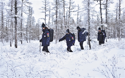 1月24日,內(nèi)蒙古阿龍山森林公安局“90后”女森林警察李慧與同事在大興安嶺原始林區(qū)踏雪巡邏。當(dāng)日最低氣溫降至-46℃,極低的氣溫使民警們的圍巾、帽子結(jié)滿冰霜。她們守護(hù)著大興安嶺腹地森林,每天驅(qū)車近百公里,徒步30余公里,保護(hù)著轄區(qū)內(nèi)的野生動(dòng)植物資源,維護(hù)著林區(qū)社會(huì)治安秩序。 王 偉攝(中經(jīng)視覺)