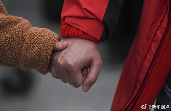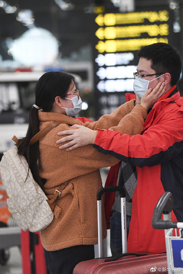 1月26日,重慶市醫(yī)療隊隊員、重慶醫(yī)科大學附屬第一醫(yī)院呼吸內科主治醫(yī)師蔣磊同未婚妻高佳在重慶江北國際機場道別。兩人原定于2月2日領結婚證,但現(xiàn)在只能推遲了?!半m然我很擔心他,也很舍不得他,但我還是鼓勵他去好好工作”,高佳說,“我們現(xiàn)在計劃改在5月20日再去領證,我希望他加油,我等我的英雄勝利歸來”。他們的短暫離別,將換來更多人早日團聚。26日晚,130余名醫(yī)務工作者組成的重慶市醫(yī)療隊從重慶出發(fā),前往湖北省孝感市支援。(記者 王全超)
