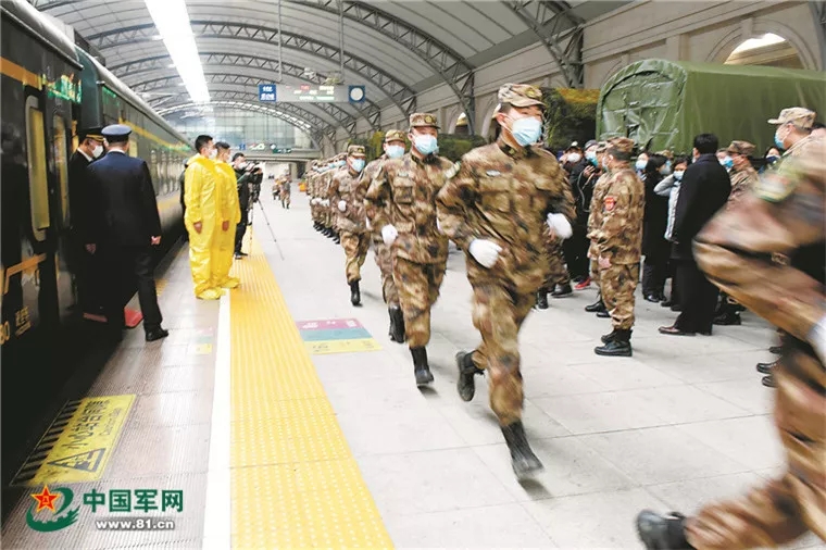 1月26日11時(shí)24分,T184列車載著解放軍緊急調(diào)撥的第一批防疫物資緩緩駛來(lái),??吭跐h口火車站站臺(tái)。