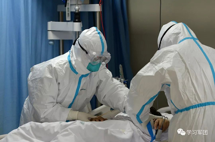 1月27日上午,海軍軍醫(yī)大學醫(yī)療隊醫(yī)護人員在漢口醫(yī)院重癥監(jiān)護室對新型冠狀病毒感染的肺炎患者進行救治。醫(yī)護人員查看患者輸液導(dǎo)管是否通暢。解放軍報記者范顯海攝