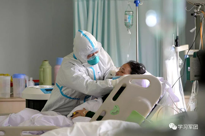 1月27日上午,海軍軍醫(yī)大學醫(yī)療隊醫(yī)護人員在漢口醫(yī)院重癥監(jiān)護室對新型冠狀病毒感染的肺炎患者進行救治。醫(yī)護人員耐心安撫患者。解放軍報記者范顯海攝