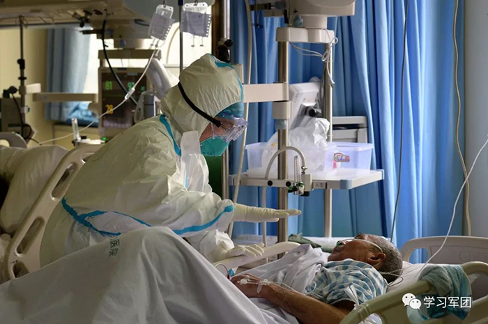 1月27日上午,海軍軍醫(yī)大學醫(yī)療隊醫(yī)護人員在漢口醫(yī)院重癥監(jiān)護室對新型冠狀病毒感染的肺炎患者進行救治。醫(yī)護人員精心護理患者。解放軍報記者范顯海攝