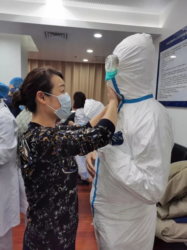 ?。▓D說:出發(fā)前,首都醫(yī)科大學(xué)宣武醫(yī)院在全員培訓(xùn)的基礎(chǔ)上,對醫(yī)護人員進(jìn)行穿脫防護服等感染防控加強培訓(xùn)。在現(xiàn)場,首都醫(yī)科大學(xué)宣武醫(yī)院呼吸科副主任醫(yī)師肖漢(右),他的愛人北京醫(yī)院醫(yī)務(wù)處副處長潘琪(左)正在用自己的專業(yè)知識,幫助丈夫規(guī)范穿戴防護服。)
