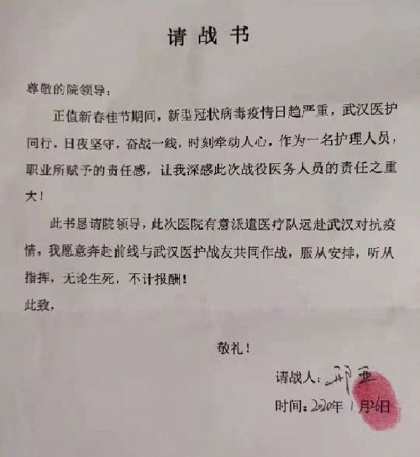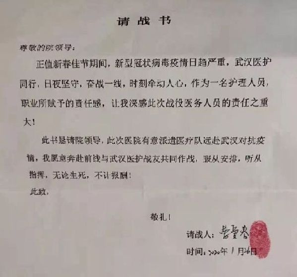 甘肅省定西市人民醫(yī)院新生兒科護士長曹愛春和護士邢亞半夜寫下請戰(zhàn)書,懇請院方批準(zhǔn)奔赴一線。落款時,兩人寫了八個字:無論生死,不計報酬。(定西市人民醫(yī)院供圖)