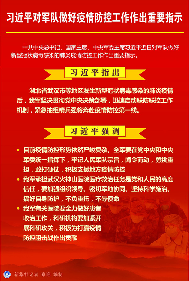 習(xí)近平強調(diào),目前疫情防控形勢依然嚴(yán)峻復(fù)雜。全軍要在黨中央和中央軍委統(tǒng)一指揮下,牢記人民軍隊宗旨,聞令而動,勇挑重?fù)?dān),敢打硬仗,積極支援地方疫情防控。我軍承擔(dān)武漢火神山醫(yī)院醫(yī)療救治任務(wù)是黨和人民的高度信任,要加強組織領(lǐng)導(dǎo)、密切軍地協(xié)同、堅持科學(xué)施治、搞好自身防護(hù),不負(fù)重托,不辱使命。我軍有關(guān)醫(yī)院要全力做好患者收治工作,科研機(jī)構(gòu)要加緊開展科研攻關(guān),積極為打贏疫情防控阻擊戰(zhàn)作出貢獻(xiàn)。