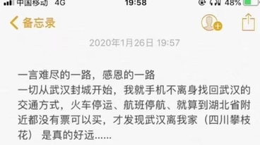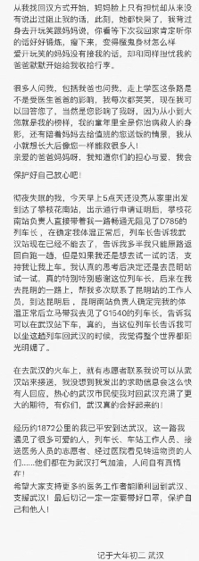 “經歷約1872公里的我已平安到達武漢,這一路我遇見了很多可愛的人,列車長、車站工作人員……他們都在為武漢打氣加油,人間自有真情在!”1月26日,白衣天使郎冰凝在自己的手機里敲出了一段動人的文字,文字的背后是鐵路人傾情護送她奔赴武漢的暖心故事。