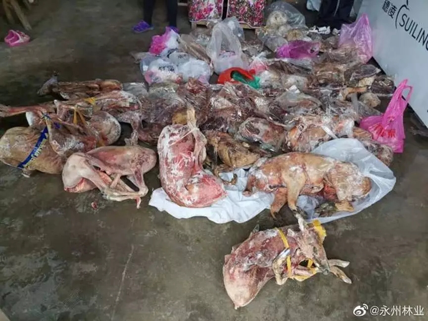 1月27日上午,正在朋友圈兜售野味的湖南省永州市祁陽(yáng)縣羊角塘鎮(zhèn)復(fù)興社區(qū)的張某沒有想到,祁陽(yáng)縣森林公安民警會(huì)如神兵天降一樣出現(xiàn)在他面前。因?yàn)榉欠ㄔ诰W(wǎng)上經(jīng)營(yíng)野生動(dòng)物,張某已被森林公安機(jī)關(guān)控制,現(xiàn)場(chǎng)查獲10只河麂凍體、1頭野豬凍體、10只竹鼠凍體、57只野兔凍體以及17袋200余羽鳥類凍體,8只鱷龜活體、兩只草龜活體。