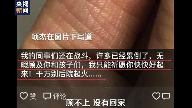 項杰在微信朋友圈寫道:“我的同事們還在戰(zhàn)斗,許多已經(jīng)累倒了,無暇顧及你和孩子們,我只能祈愿你快快好起來!千萬別后院起火?!?/p>