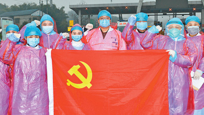 2月5日,在湖南益陽(yáng)市高速公路鄧石橋出口,參與對(duì)乘車(chē)人進(jìn)行體溫監(jiān)測(cè)的康雅醫(yī)院黨員重溫入黨誓詞。為發(fā)揮黨員的模范帶頭作用,益陽(yáng)各交通要道路口、車(chē)站卡口工作人員成立了臨時(shí)黨支部,設(shè)立了黨員示范崗。宣國(guó)祥攝(人民視覺(jué))