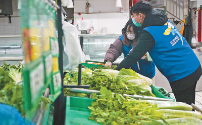 2月5日,在江蘇南京江寧區(qū)秣陵街道牛首社區(qū)一家超市,網(wǎng)格員陶慧(左)、王俊在幫助居家隔離的居民買(mǎi)菜。新華社記者 季春鵬攝