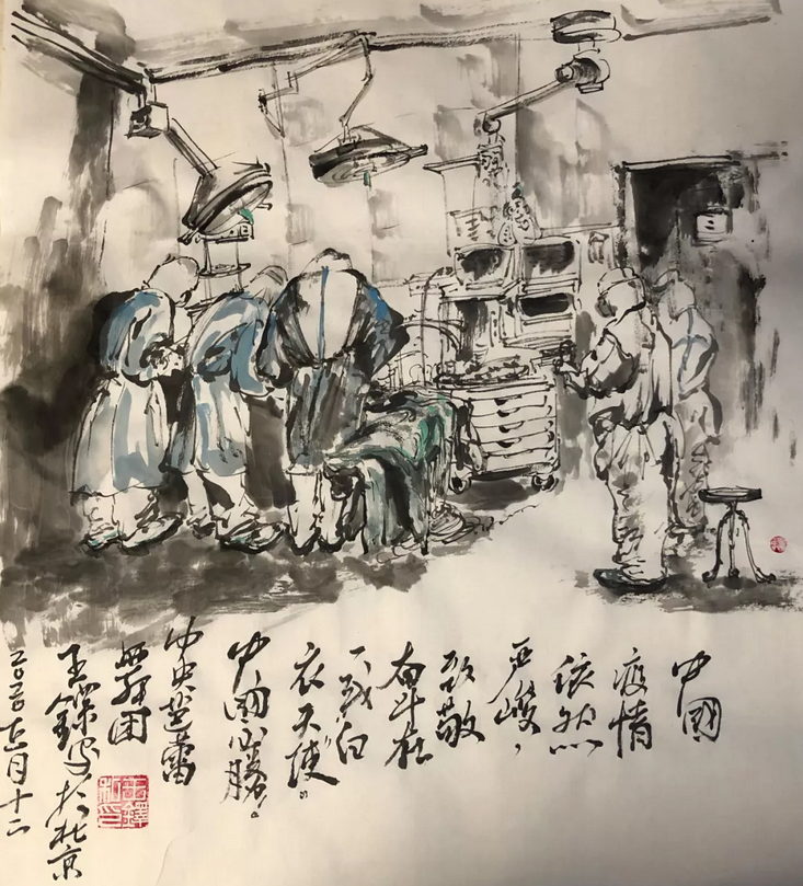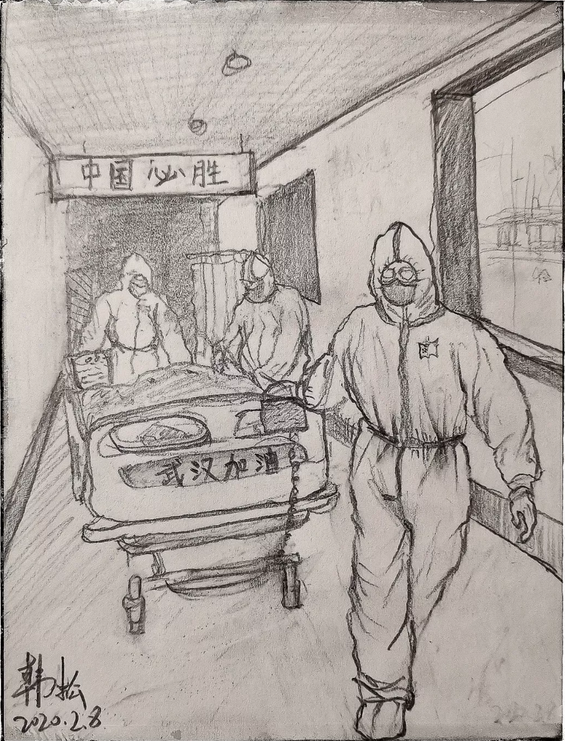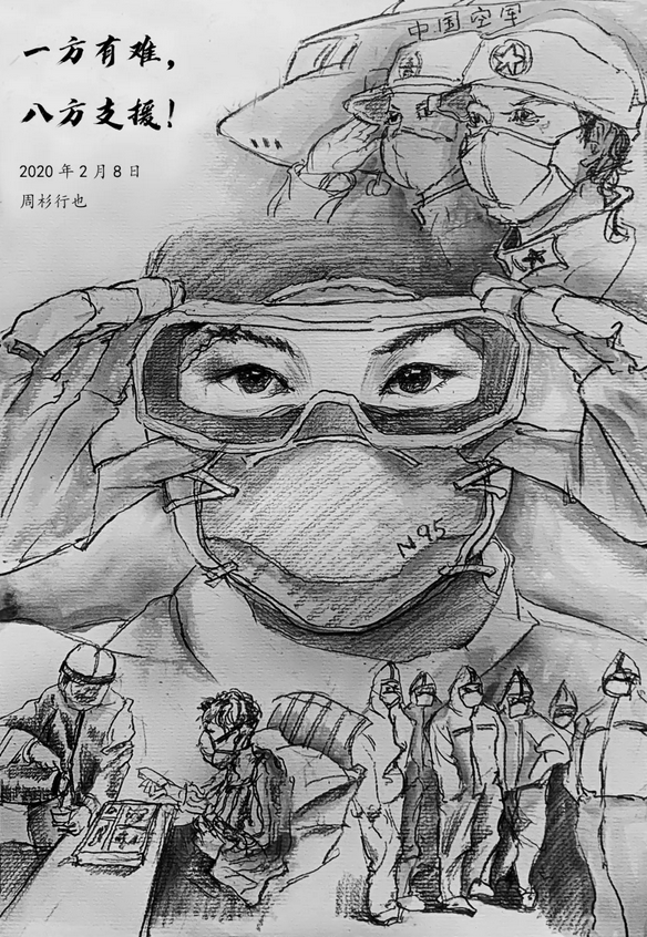 素描畫《一方有難,八方支援!》作者:中央芭蕾舞團(tuán)燈光設(shè)計 周杉行也