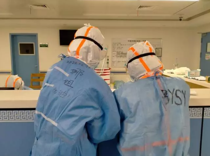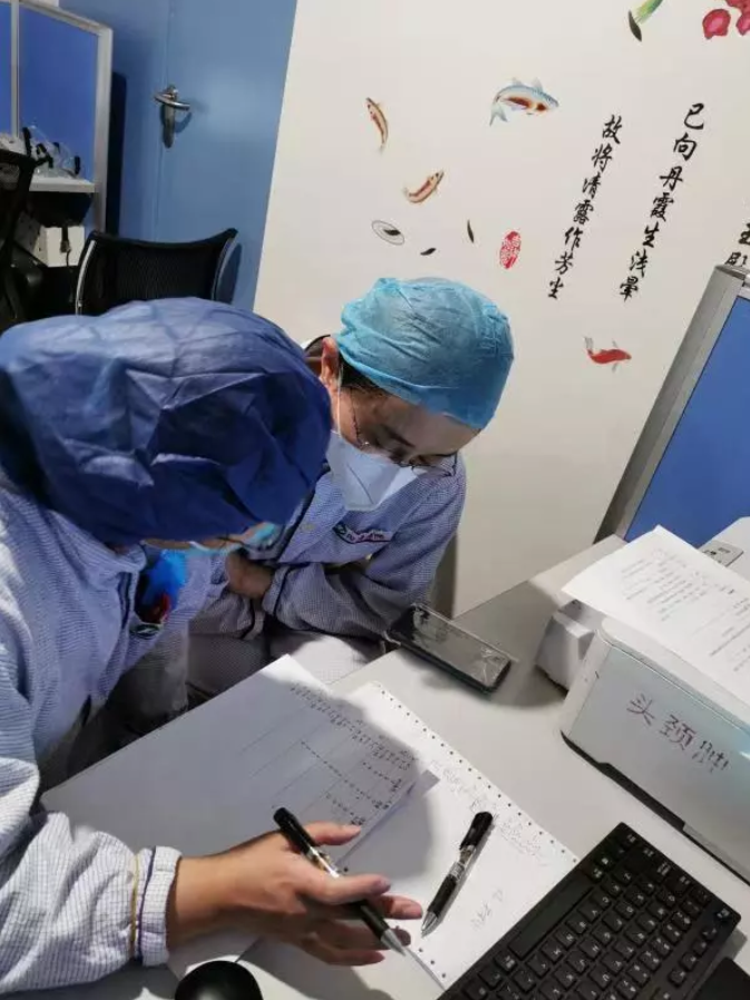 啟用危重癥新病房的第一天,姝姐上了一個“24小時白連夜班”。第一位來診的是個危重患者,姝姐主動請纓:“來,我收這個病人。”凌晨3點,到了該下班的時間,姝姐還在寫病歷,她說污染區(qū)的護(hù)士還沒換好衣服,“等她們出來,我再結(jié)束工作,我們一起離開”。而這一等又是一個小時……下午15點到21點又輪到北醫(yī)三院隊員們上崗了,她再次主動請纓參加工作,我有些擔(dān)心她的身體會吃不消,本想勸阻一下,誰知她微微一笑說:“你姝姐有啥不行的!”直到22點30,姝姐才從隔離病房出來,口罩和眼罩已經(jīng)壓紅了鼻梁,衣服早已被汗水浸濕了,可她仍然面帶著微笑。