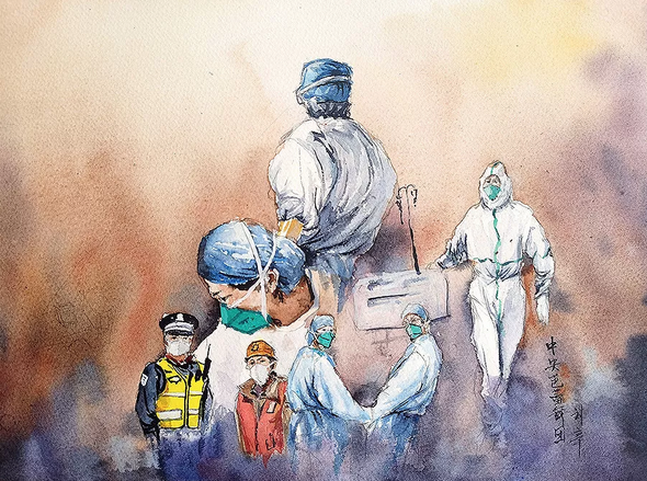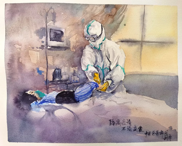 水彩畫《隔離疫情 不隔離愛》作者:中央芭蕾舞團(tuán)舞美設(shè)計 劉辛