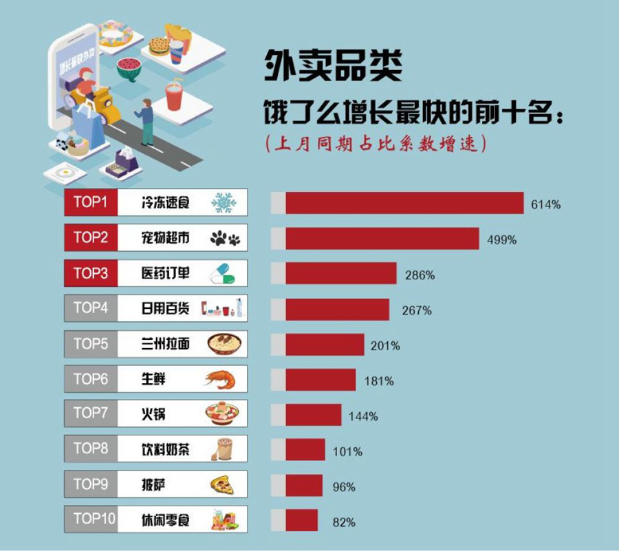 1.環(huán)比12月份,冷凍速食增長(zhǎng)了6倍,是目前“餓了么”平臺(tái)外賣品類中占比增長(zhǎng)最快的一個(gè)品類。