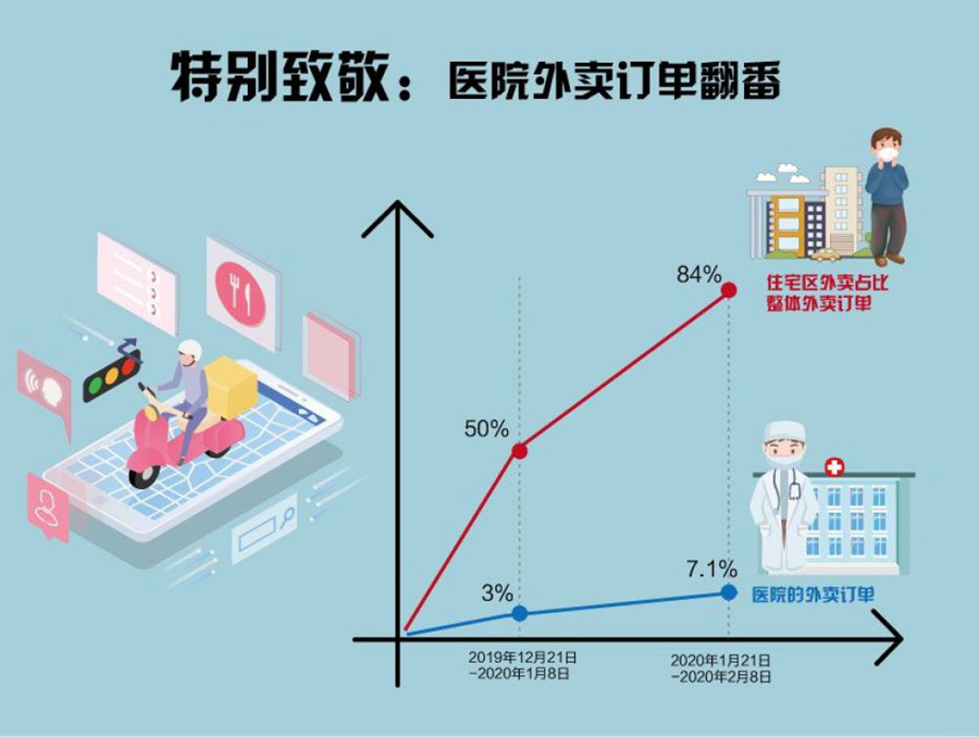 “餓了么”數(shù)據(jù)顯示,自疫情爆發(fā)以來,醫(yī)院的外賣訂單占比上升了一倍,加班加點(diǎn),外賣訂單猛增,讓我們向戰(zhàn)斗在一線的醫(yī)務(wù)工作者致敬!