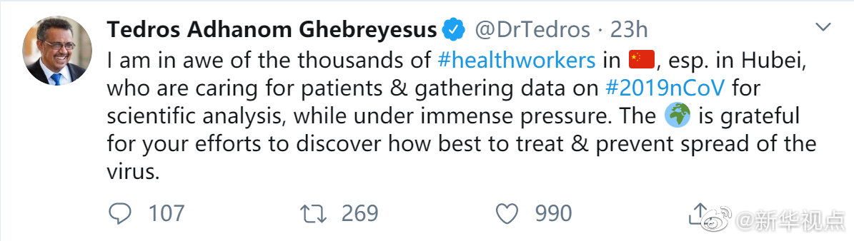 世界衛(wèi)生組織總干事譚德塞9日通過(guò)社交媒體,向抗擊新冠肺炎疫情的中國(guó)醫(yī)護(hù)人員致敬。“我向在中國(guó)的醫(yī)護(hù)人員、特別是在湖北省的醫(yī)護(hù)人員致敬。他們?cè)诰薮髩毫χ?,不僅在照顧(新冠肺炎)患者,還在為針對(duì)新冠病毒的科學(xué)分析搜集數(shù)據(jù)。全世界感激你們?yōu)檎业阶詈玫闹委熮k法和防止病毒蔓延所作的努力?!保ㄓ浾吡柢?劉曲)