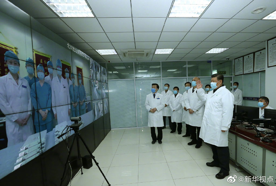 10日下午,習(xí)近平總書記來到首都醫(yī)科大學(xué)附屬北京地壇醫(yī)院,視頻連線正在病房值班的醫(yī)務(wù)人員,了解患者救治情況,聽取意見和建議,并向全國奮戰(zhàn)在抗擊疫情一線的廣大醫(yī)務(wù)工作者致以崇高敬意和衷心感謝。他叮囑大家做好自我防護(hù),避免感染減員。他要求各方面做好后勤保障,生活、安全、人文關(guān)懷等要跟上,不要讓一線醫(yī)務(wù)工作者受委屈。(文字記者張曉松 攝影記者鞠鵬、謝環(huán)馳)