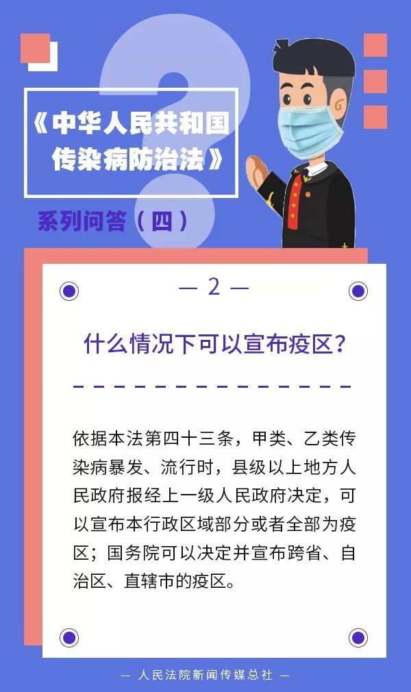 當(dāng)前,新型冠狀病毒感染肺炎疫情蔓延,正嚴(yán)重影響著社會正常生產(chǎn)生活秩序。傳染病防治關(guān)系到每一個人的生命健康。面對傳染病的肆虐,如何利用法律武器來抗擊疫情?您對傳染病防治法知多少?小編將為您作出系列介紹。今天推出系列問答之四,敬請關(guān)注!