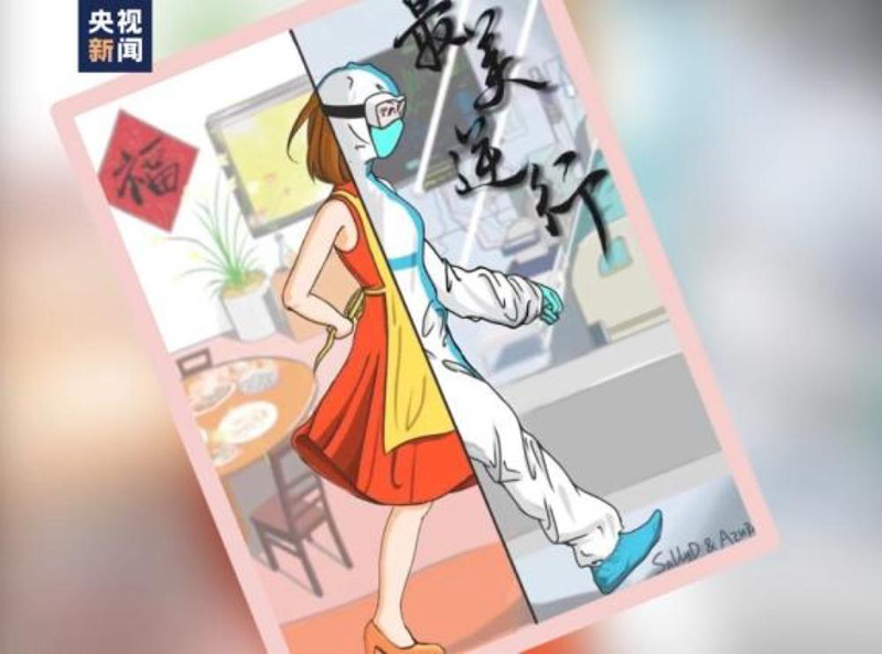 設(shè)計師董思喬的母親,是北京大學(xué)人民醫(yī)院的一名醫(yī)務(wù)工作者。在董思喬七歲那年,正逢非典暴發(fā),她的母親堅守崗位留在醫(yī)院救治患者。十七年后,新冠肺炎來襲,她看到很多醫(yī)務(wù)工作者也像當(dāng)年她的母親一樣在最危險的地方戰(zhàn)斗,義無反顧,馳援武漢。于是,她拿出畫筆畫出她心中醫(yī)務(wù)工作者們最美的樣子:“身后,是飄香的飯菜,是溫馨的家;面前,是防疫一線,是需要救治的患者。逆行者們,愿你們平安歸來?!?/p>