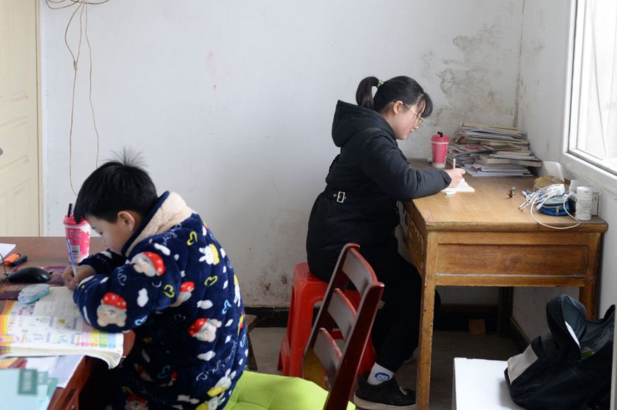 崔愛國(guó)和周超群的兩個(gè)孩子在衛(wèi)生室已消毒的隔間內(nèi)學(xué)習(xí)。(新華社記者黃博涵 攝)