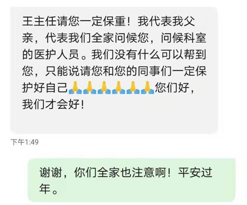 1月30日晚上10時(shí)許,武漢市中心醫(yī)院呼吸與危重癥醫(yī)學(xué)科副主任醫(yī)師王亮朝拖著疲憊的身子回到家里,意外收到了之前一位患者發(fā)過(guò)來(lái)的加油短信,簡(jiǎn)單的幾句話,讓他感覺十分溫暖,充滿力量。