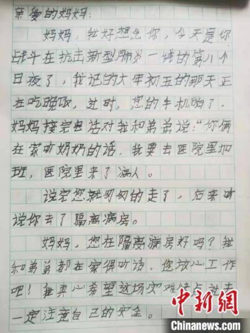 孩子在信中寫道:“媽媽,我好想念你,今天是您戰(zhàn)斗在抗擊新型肺炎一線的第八個(gè)日夜了……媽媽,你是我崇拜的英雄。”