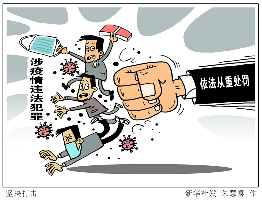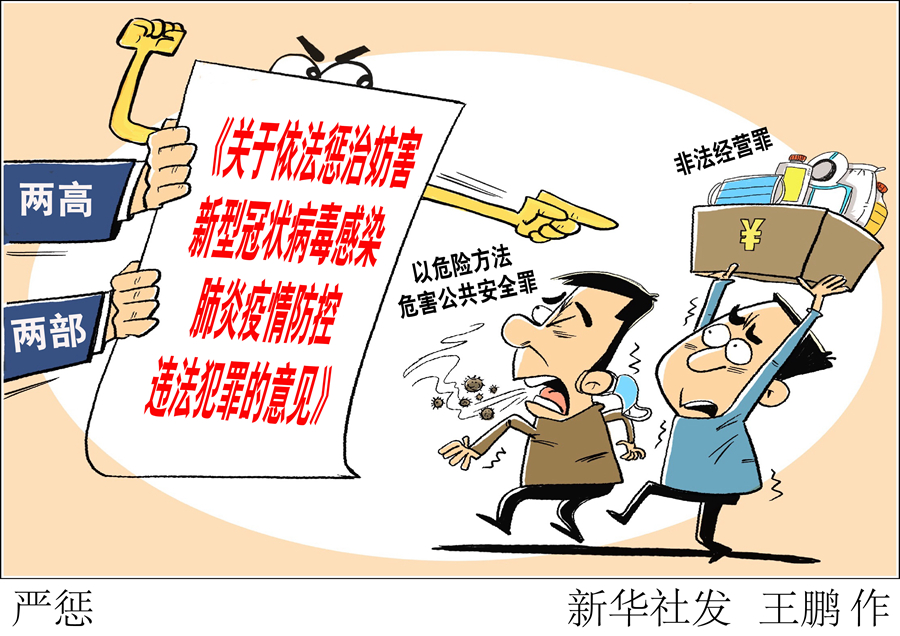2月10日,最高人民法院、最高人民檢察院、公安部、司法部聯(lián)合發(fā)布關(guān)于依法懲治妨害新型冠狀病毒感染肺炎疫情防控違法犯罪的意見,針對(duì)當(dāng)前突出的涉疫情防控違法犯罪,統(tǒng)一執(zhí)法標(biāo)準(zhǔn)、程序、依據(jù),并強(qiáng)調(diào)加強(qiáng)治安管理、市場(chǎng)監(jiān)管等執(zhí)法工作,加大對(duì)暴力傷醫(yī)違法犯罪行為打擊力度。 新華社發(fā) 王鵬 作