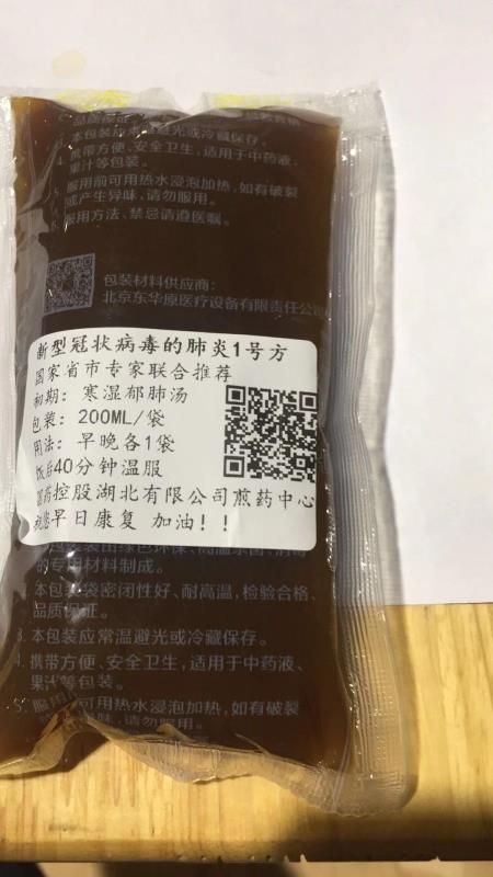 每天的診療,醫(yī)生給我開的藥有鹽酸阿比多爾片、鹽酸莫西沙星片、磷酸奧司他韋膠囊、蓮花清瘟膠囊和復(fù)方甲氧那明膠囊,以及袋裝的中藥肺炎1號(hào)方“寒濕郁肺湯”,每袋是200ml。護(hù)士會(huì)一次發(fā)給病人幾天的藥,吃完了再找他們要。有時(shí)候護(hù)士會(huì)提醒你吃藥,但是病人太多了忙不過來,我們病友間就要互相提醒。