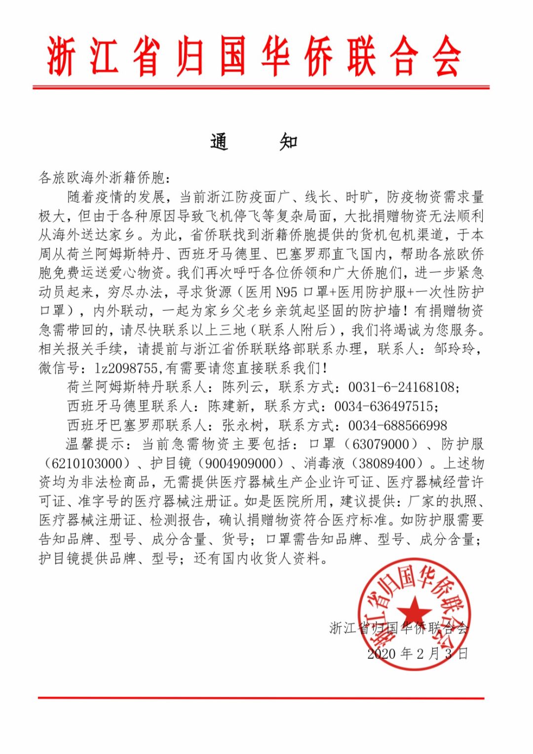 大疫當(dāng)前爭(zhēng)分奪秒。2月3日,一則浙江省歸國(guó)華僑聯(lián)合會(huì)聯(lián)系貨運(yùn)包機(jī)直飛國(guó)內(nèi)尋求抗疫捐贈(zèng)物資的通知,將眾多歐洲華僑華人凝聚在一起。