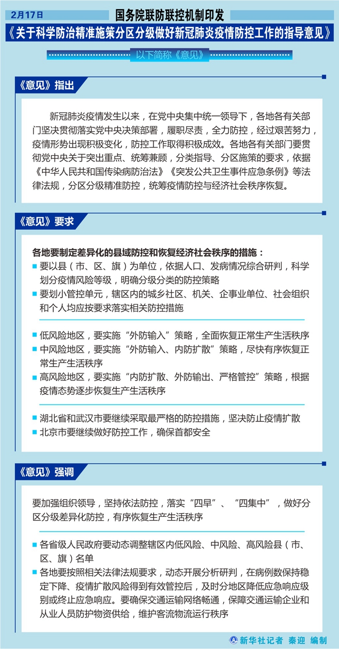 新華社北京2月18日電? 2月17日,國務(wù)院聯(lián)防聯(lián)控機制印發(fā)《關(guān)于科學(xué)防治精準(zhǔn)施策分區(qū)分級做好新冠肺炎疫情防控工作的指導(dǎo)意見》(以下簡稱《意見》)。