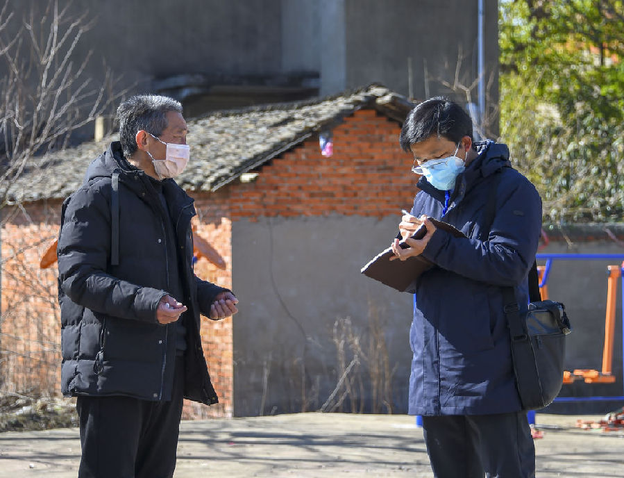記者伍曉陽(yáng)(右)在浐川村采訪。新華社記者 胡虎虎 攝