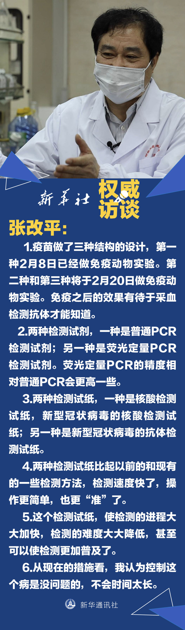 這些階段性研究成果是什么?三分鐘就可快速檢測新冠病毒的檢測試紙準(zhǔn)確率有多高?新冠病毒疫苗抗原的動物試驗(yàn)效果如何?什么時間能夠推廣應(yīng)用?圍繞這些問題,新華社記者2月18日專訪了張改平院士。