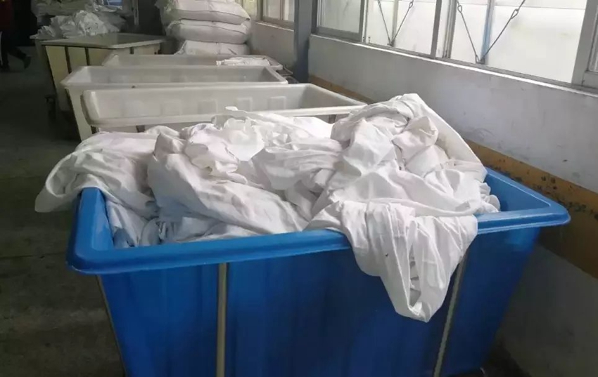 每趟列車到達終點站后,臥具都會重新更換,拆卸下的臥具由專人運送至洗滌消毒中心。被套、枕套、床單等分別放在不同的待洗推車?yán)?,工作人員會根據(jù)臥具的種類、污漬程度進行分揀。