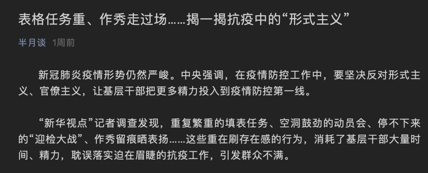 在中部地區(qū)一個疫情重點市轄區(qū),半月談記者看到,指揮部的會議桌擺了18本厚厚的紅皮紙質材料,均為該區(qū)新冠肺炎疫情防控措施落實臺賬,包括大型活動管控、醫(yī)療救治、輿情引導、重點區(qū)域管理、流調報告等十多方面資料。該區(qū)相關負責人表示,這些材料是給各級領導督查檢查作參考用的。