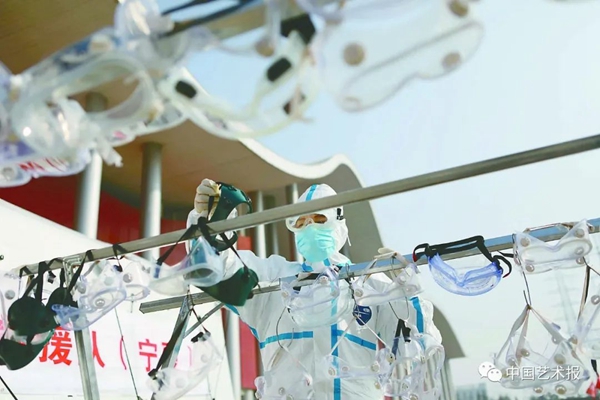 2月22日,武漢市武漢客廳方艙醫(yī)院外,援鄂醫(yī)療隊(duì)工作人員清潔護(hù)目鏡。 中國(guó)攝協(xié)赴湖北抗擊疫情攝影小分隊(duì)?李舸 攝