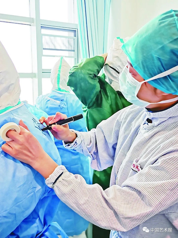 2月22日,武漢華中科技大學(xué)同濟(jì)醫(yī)學(xué)院附屬同濟(jì)醫(yī)院中法新城院區(qū),北京醫(yī)院國(guó)家醫(yī)療隊(duì)負(fù)責(zé)的病區(qū)。醫(yī)護(hù)人員在防護(hù)服上寫(xiě)下姓名,整裝待發(fā)。中國(guó)攝協(xié)赴湖北抗擊疫情攝影小分隊(duì) 陳黎明 攝
