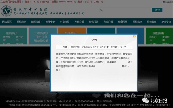 昨晚,湖北孝感市中心醫(yī)院官網(wǎng)發(fā)布訃告: