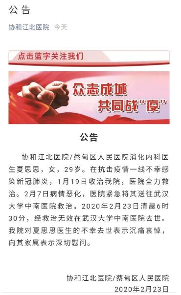 23日下午2時(shí)許,協(xié)和江北醫(yī)院發(fā)布公告,哀悼夏思思醫(yī)生。公告稱,協(xié)和江北醫(yī)院/蔡甸區(qū)人民醫(yī)院消化內(nèi)科醫(yī)生夏思思,女,29歲。因在抗擊疫情一線不幸感染新冠肺炎,于2月23日清晨6時(shí)30分在武漢大學(xué)中南醫(yī)院去世。