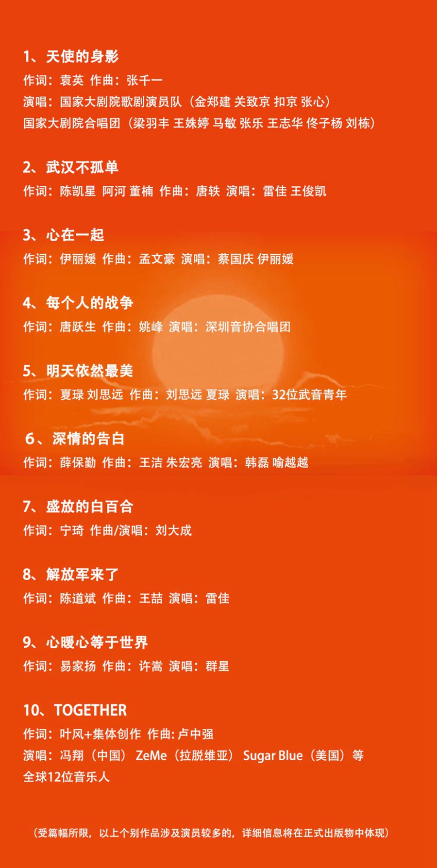 目前,第二批入選作品即將與聽眾見面。此次精選的10首抗疫優(yōu)秀主題歌曲,凝結(jié)社會(huì)各界的創(chuàng)作力量,包括各地音樂(lè)工作者、音樂(lè)院校、藝術(shù)院團(tuán)、專業(yè)音樂(lè)公司等,主要表現(xiàn)疫情防控工作進(jìn)入關(guān)鍵階段以來(lái),全國(guó)上下一盤棋,眾志成城決戰(zhàn)決勝武漢抗疫保衛(wèi)戰(zhàn)的堅(jiān)定決心和必勝信念。