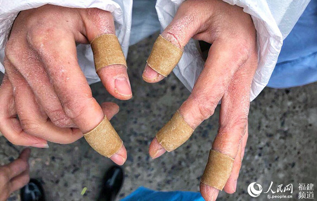 “我每天只能通過視頻和媽媽聊天?!敝x小燕每天早出晚歸,母子倆很難見上一面。曾元博說,因為媽媽每天上下班都要進(jìn)行嚴(yán)格消毒,雙手已經(jīng)被干裂出一道道血口?!皨寢尩氖忠呀?jīng)干裂得不成樣子了,一使勁就會流血,真讓我們心疼。”