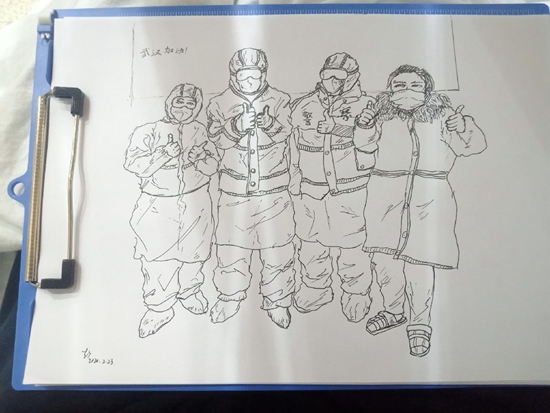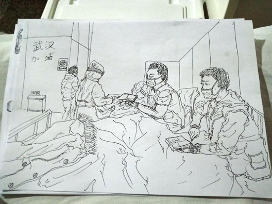 他把畫(huà)的“方艙生活”發(fā)到了微博上——兩位病人在床,護(hù)士俯身照顧。畫(huà)中醫(yī)院的墻上被他特意寫(xiě)了四個(gè)字:“武漢加油?!保ǔ堂顺?/p>