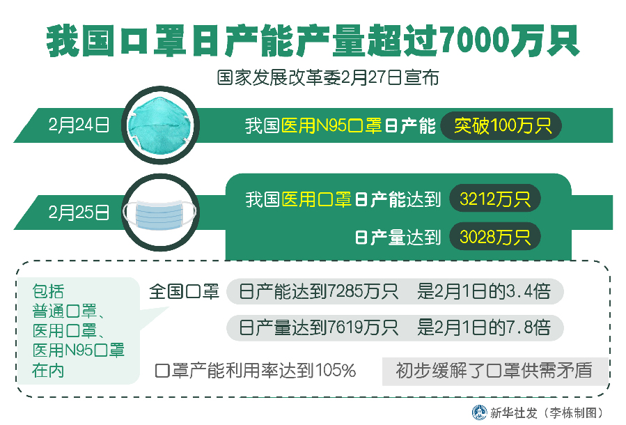 新華社北京2月27日電(記者安蓓)國家發(fā)展改革委27日宣布,繼2月24日我國醫(yī)用N95口罩日產(chǎn)能突破100萬只后,2月25日,我國醫(yī)用口罩日產(chǎn)能達(dá)到3212萬只,日產(chǎn)量達(dá)到3028萬只;包括普通口罩、醫(yī)用口罩、醫(yī)用N95口罩在內(nèi),全國口罩日產(chǎn)能達(dá)到7285萬只,日產(chǎn)量達(dá)到7619萬只,分別是2月1日的3.4倍、7.8倍,口罩產(chǎn)能利用率達(dá)到105%,初步緩解了口罩供需矛盾。