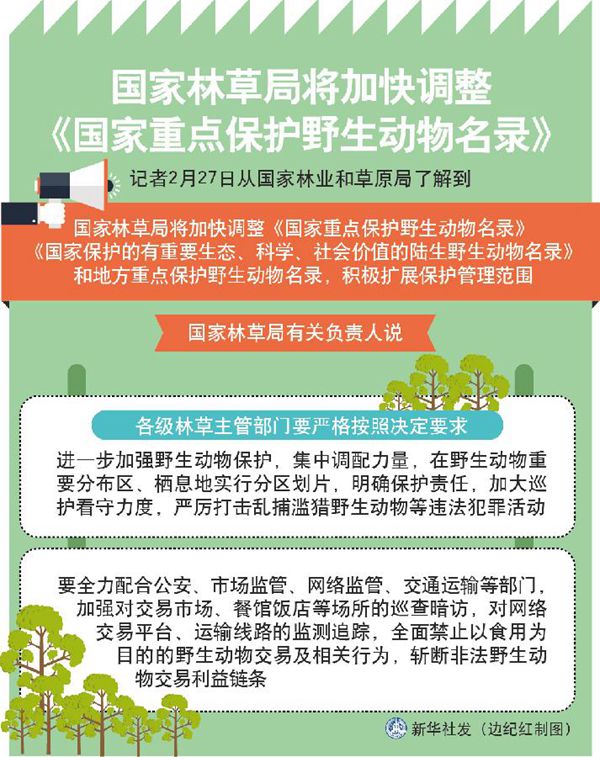 新華社北京2月27日電(記者胡璐)記者27日從國(guó)家林業(yè)和草原局了解到,國(guó)家林草局將加快調(diào)整《國(guó)家重點(diǎn)保護(hù)野生動(dòng)物名錄》《國(guó)家保護(hù)的有重要生態(tài)、科學(xué)、社會(huì)價(jià)值的陸生野生動(dòng)物名錄》和地方重點(diǎn)保護(hù)野生動(dòng)物名錄,積極擴(kuò)展保護(hù)管理范圍。