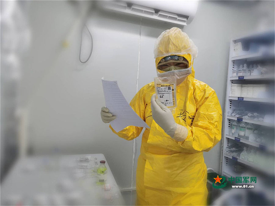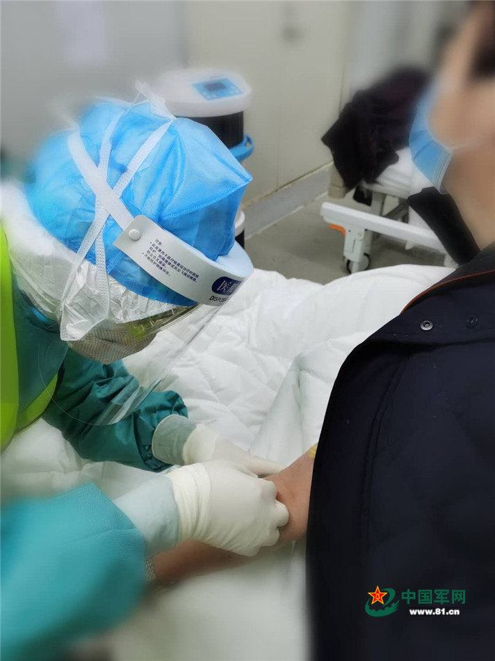 今天的主要任務(wù)是給18名病人抽血。這項(xiàng)平時(shí)對(duì)我來說簡單的不能再簡單的任務(wù),此刻卻充滿了挑戰(zhàn)性??谡?、帽子、手套、防護(hù)服、護(hù)目鏡、防護(hù)面屏都給抽血帶來了極大的困難,呼出的熱氣讓護(hù)目鏡變得模糊,昏暗的燈光讓本就有限的視線變得更加不足,三層防護(hù)手套讓抽血也變得毫無手感。在抽血過程中,一個(gè)大媽問道:“姑娘,你們是來自部隊(duì)的么?”我看著她那親切的眼神,笑著點(diǎn)了點(diǎn)頭。大媽露出了信任的微笑,“有你們?cè)?,我就放心了。”這句話讓我的內(nèi)心久久不能平靜。