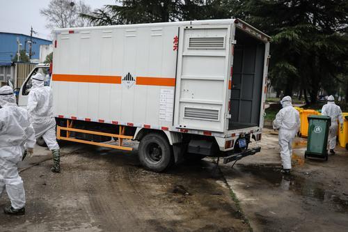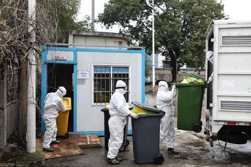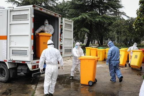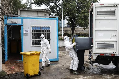 2月26日,湖北省武漢市,幾名醫(yī)療廢物處理員在搬運(yùn)醫(yī)療垃圾。中青報(bào)·中青網(wǎng)記者 趙迪/攝